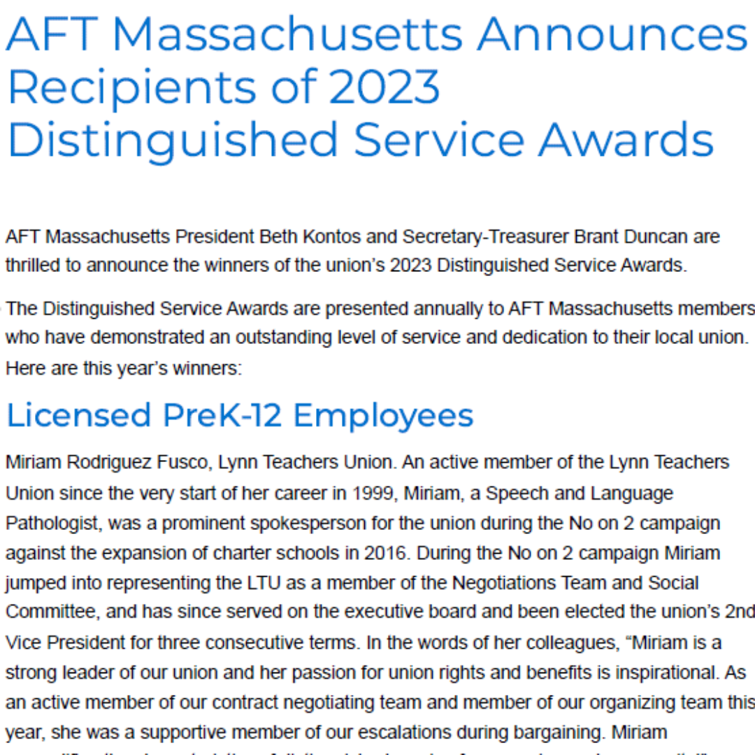 AFT Massachusetts Announces Recipients of 2023 Distinguished Service Awards